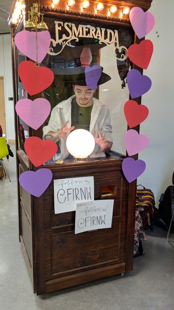 FIR performs self-promo each term to recruit students to apply to FIR for the upcoming term. At the time I joined, all the planning and creative work had been done for the Valentine’s Day event, so along with answering student questions about the organization, I also volunteered to be a hawker, pulling in students to